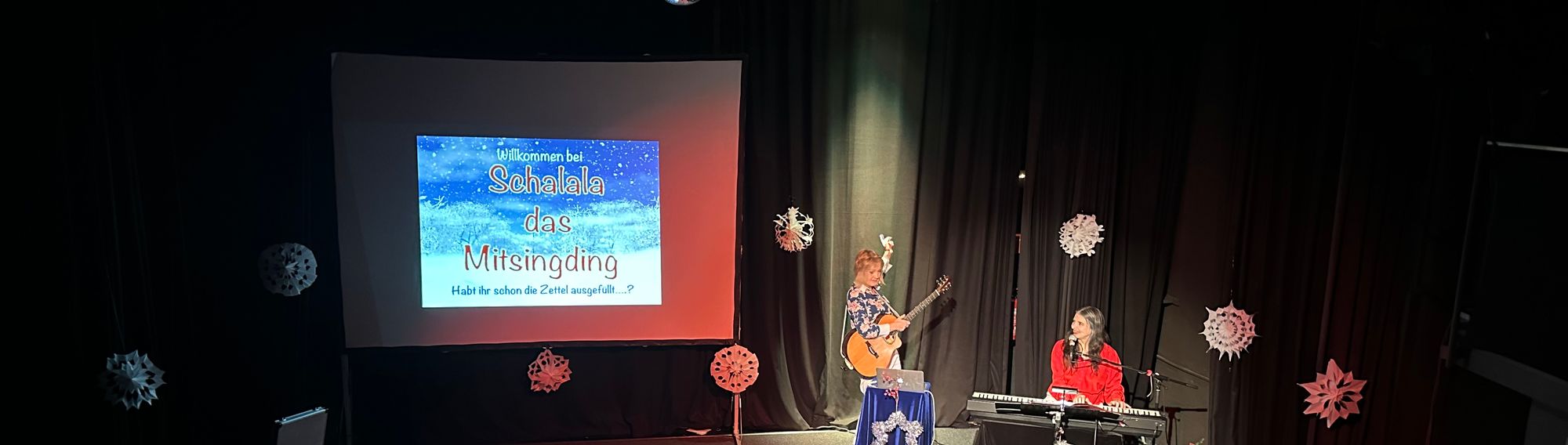 Damit alle auch ab der zweiten Strophe dabeibleiben, werden die Texte gut lesbar an die Wand projiziert. Der Abend gliedert sich in drei Sets, wobei das zweite Set jeweils einem bestimmten Thema gewidmet wird.